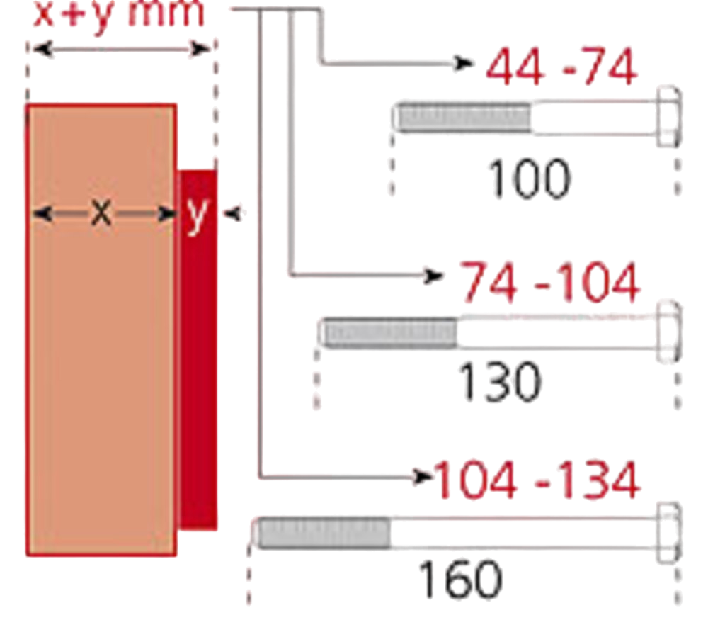 Bulten (diameter 12 mm) finns i följande längder och köpes vid behov separat!