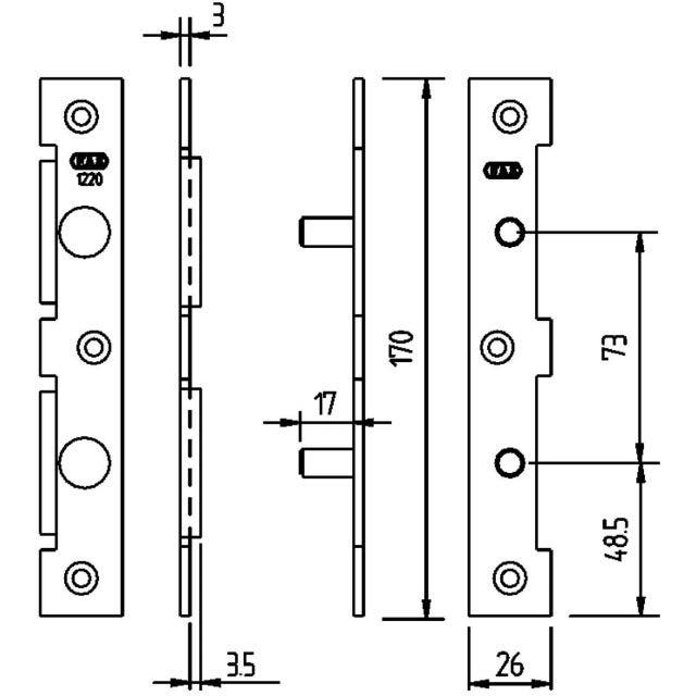 - Består av ett slutbleck som montras in i karmen och en platta med två härdade tappar som monteras in i dörren.