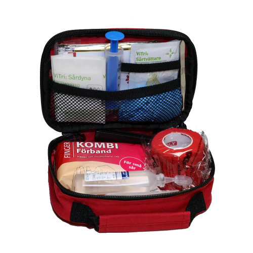 Första hjälpen-kit Hund är en lämplig väska för akuta skador som kan drabba ditt husdjur. Det här första hjälpen-kitet har förbandsmaterial av hög kvalitet som är enkelt och effektivt att använda. Särskilt bra passar det dig som är en aktiv hund- eller kattägare som tränar, ställer ut och tävlar. Väskan är liten och smidig och du kan lätt bära med dig den, till exempel i bältet. Den är lätt att lägga med i packningen eller så låter du den ha sin givna plats i bilen.