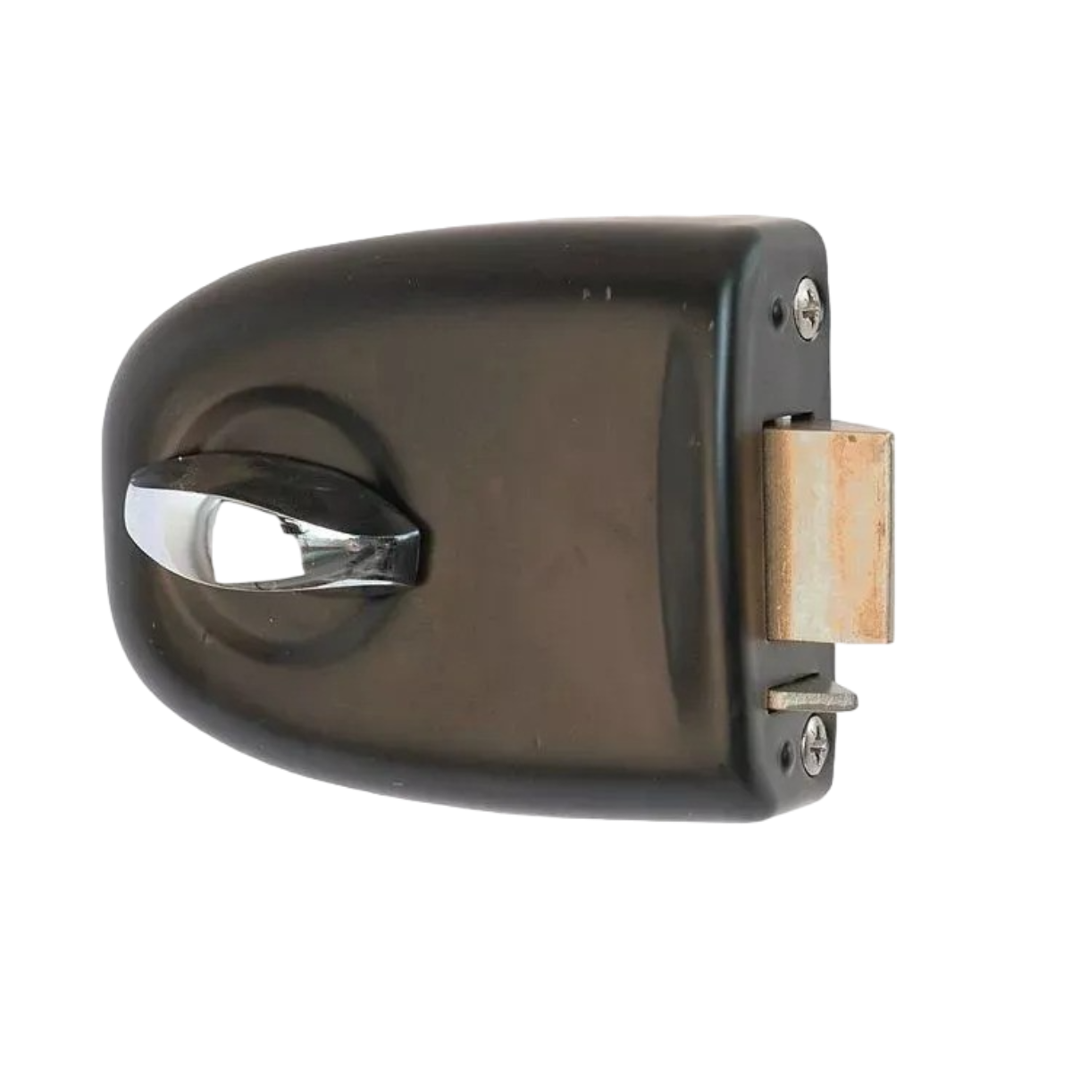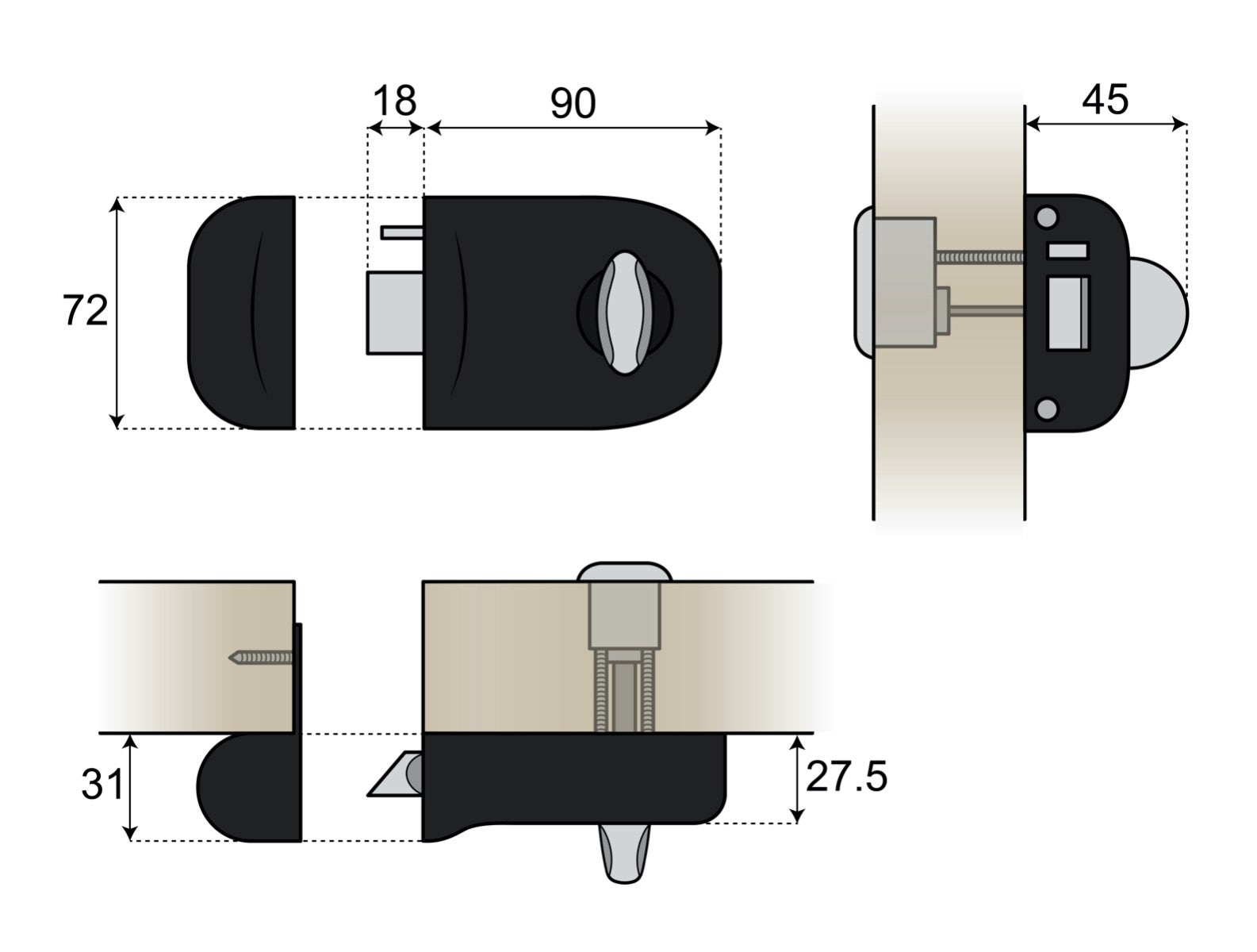 Dörrlåset monteras utanpå insidan av dörren och låses med låscylinder från utsidan och med vred på insidan av dörren.