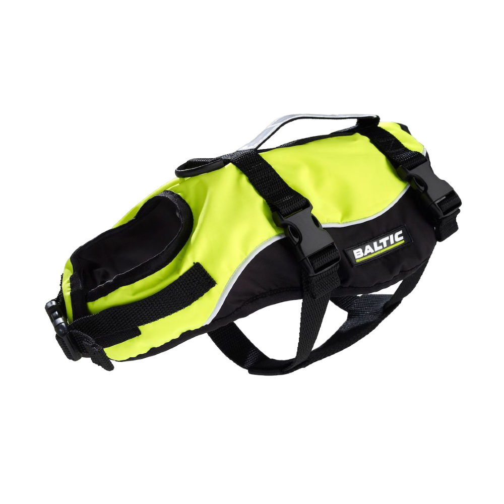 Med flytvästen Maja från Baltic så kan din vän tryggt följa med ut på sjön! Västen har D-ring för fäste av koppel, omlottknäppning i hals, reflex på lyfthandtaget och UV-gult high visibility tyg och sidorna är svarta för att inte missfärgas.
