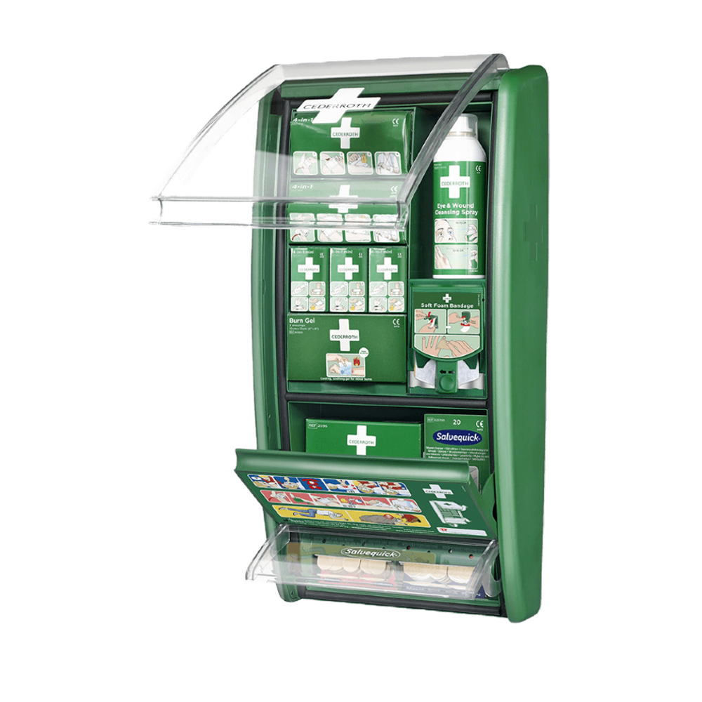 Ett problem som många arbetsplatser har är att Första Hjälpen-utrustningen lätt blir dammig och smutsig, därför har Cederroth utformat stationen med en skyddande lucka så att produkterna ska hållas fräscha och dammfria. Den transparenta luckan gör det enkelt att se när det är dags att fylla på produkter.