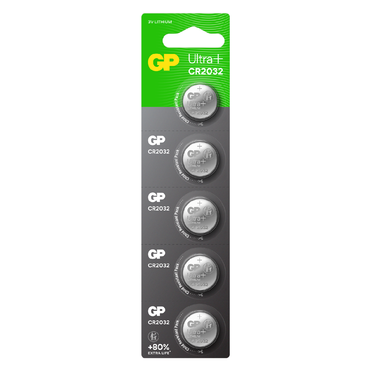 Knappcell GP Ultra Plus Lithium CR2032 passar många små elektroniska enheter, som leksaker, klockor, bilnycklar, bankdosor, fjärrkontroller, kalkylatorer och kameror. Den ger upp till 80 % längre livslängd tack vare sin patenterade Wavy Net-teknologi.