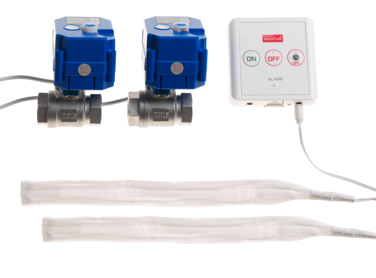 Vattensensorerna placeras i eller under diskbänken och under diskmaskinen på det vattentäta plastskikt som finns där. Vattensensorerna ansluts med kabel direkt in i centralenheten. Centralenheten och de motordrivna kulventilerna placeras i diskbänkskåpet. När en vattensensor detekterar vatten går en signal till centralenheten som omedelbart börjar larma och stänga av vattnet. Därmed undviks en stor dyr vattenskada. Centralenheten drivs med medföljande 12V-adapter.