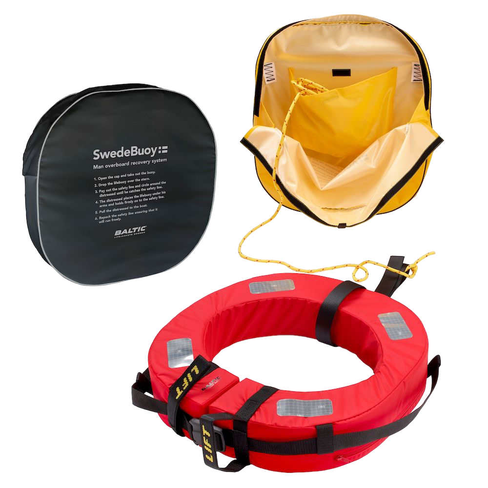 Swedebouy från Baltic är ett unikt och elegant man-överbord-system med livboj och 38 meter flytande lina. Livbojen har åtta reflexer, grepphandtag, två rejäla lyfthandtag samt snabbspänne. Swedebouy är smart förpackad i en snygg stilren förvaringsväska som enkelt och utan verktyg kan monteras på båten.