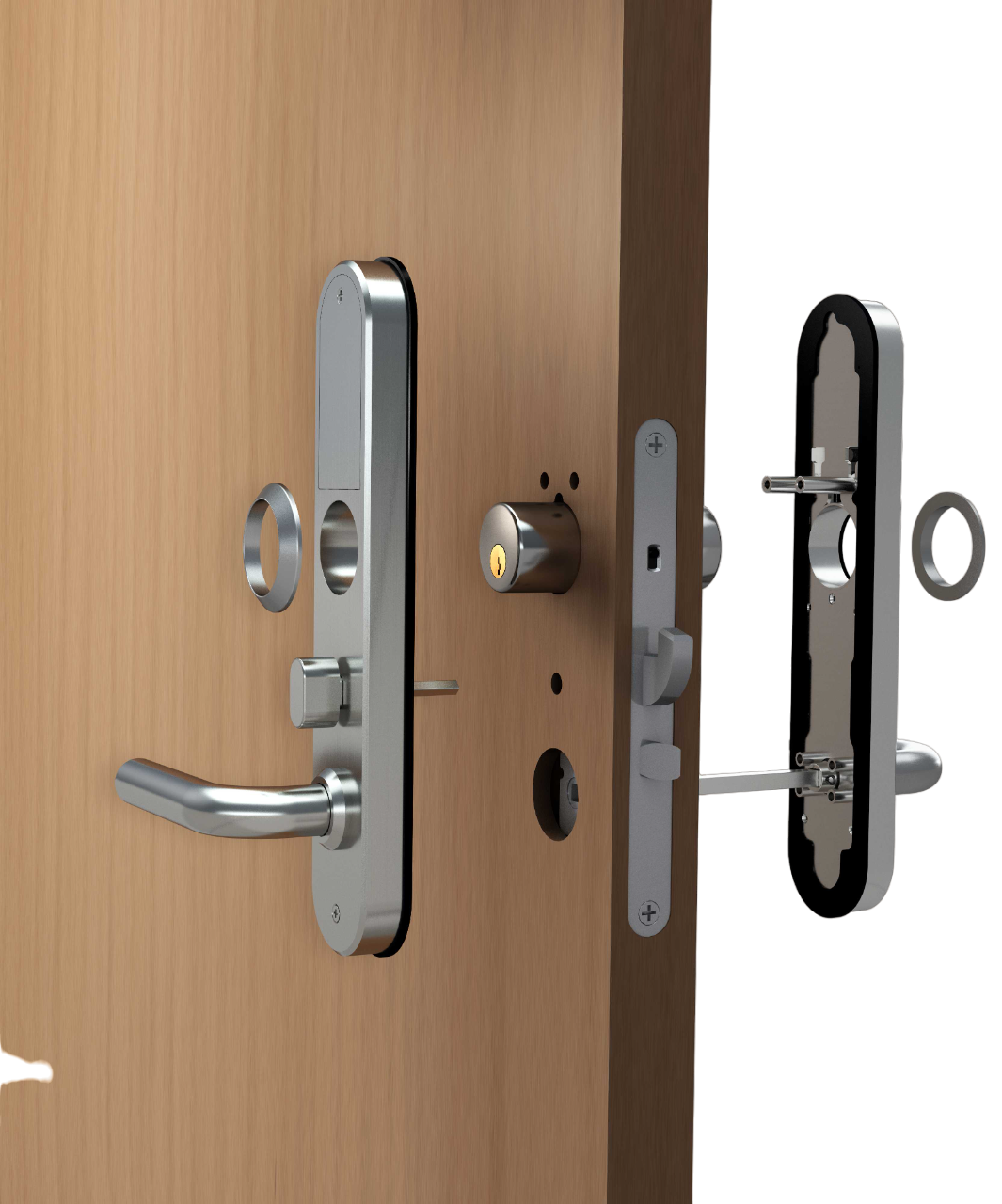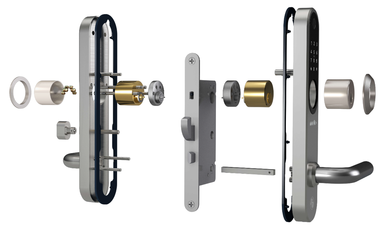 Dörren låses automatiskt genom att dörrtrycket kopplas ur när dörren stängs. Dörren reglas (hakregeln skjuts ut) genom att dra upp dörrtrycket. För att låsa upp dörren måste man använda fingeravtryck, kod, kort eller app och trycka ner dörrtrycket. Dörrtrycket drar in både tryckesfallet och hakregeln. Den här lösningen är helt nyckelfri. -