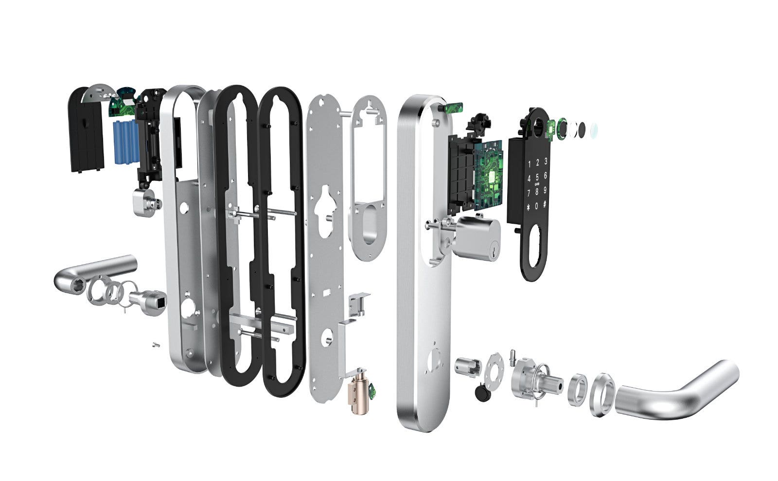 Dörren låses automatiskt genom att dörrtrycket kopplas ur när dörren stängs. Dörren reglas (reglarna skjuts ut) genom att dra upp dörrtrycket. För att låsa upp dörren måste man använda fingeravtryck, kod, kort eller app och trycka ner dörrtrycket. Dörrtrycket drar in både tryckesfallet och hakregeln. Den här lösningen är helt nyckelfri. -