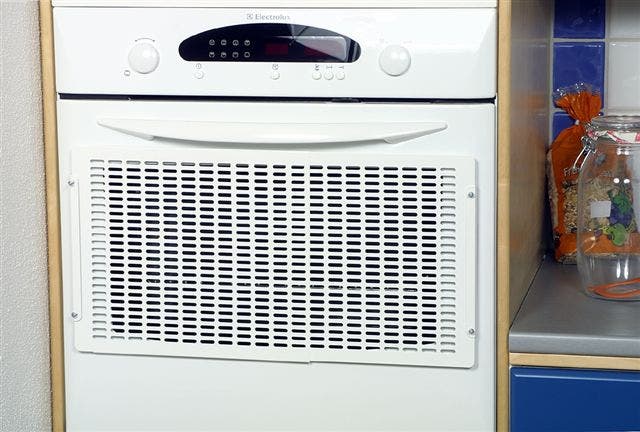 I ugnsluckan fäster du med en värmetålig tejp de lister i vilka själva gallret fästes med fyra skruv. Tejpen går att ta bort när skyddet inte längre behövs. Spisskyddet är också avtagbart vid behov.