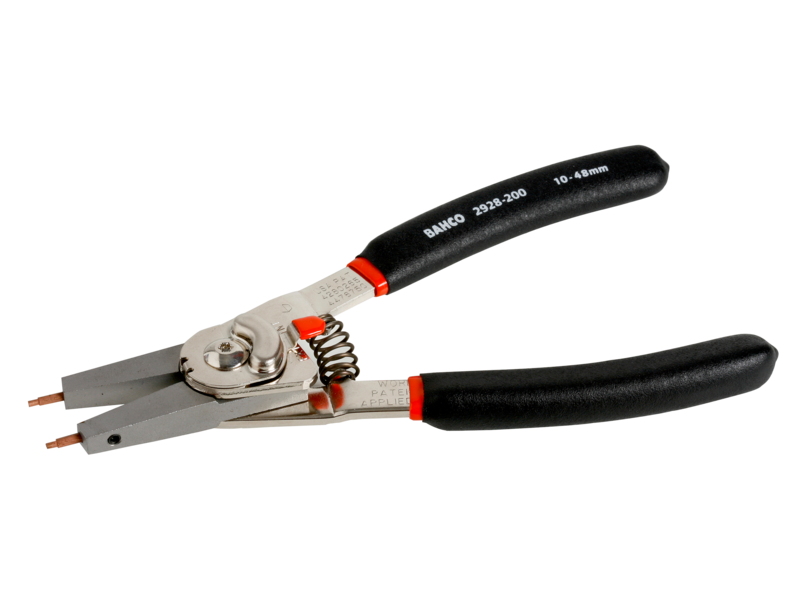 - Patenterade tänger med utbytbara spetsar (raka 15° och 90°) som enkelt kan ställas om för såväl för utvändiga som invändiga spårringar